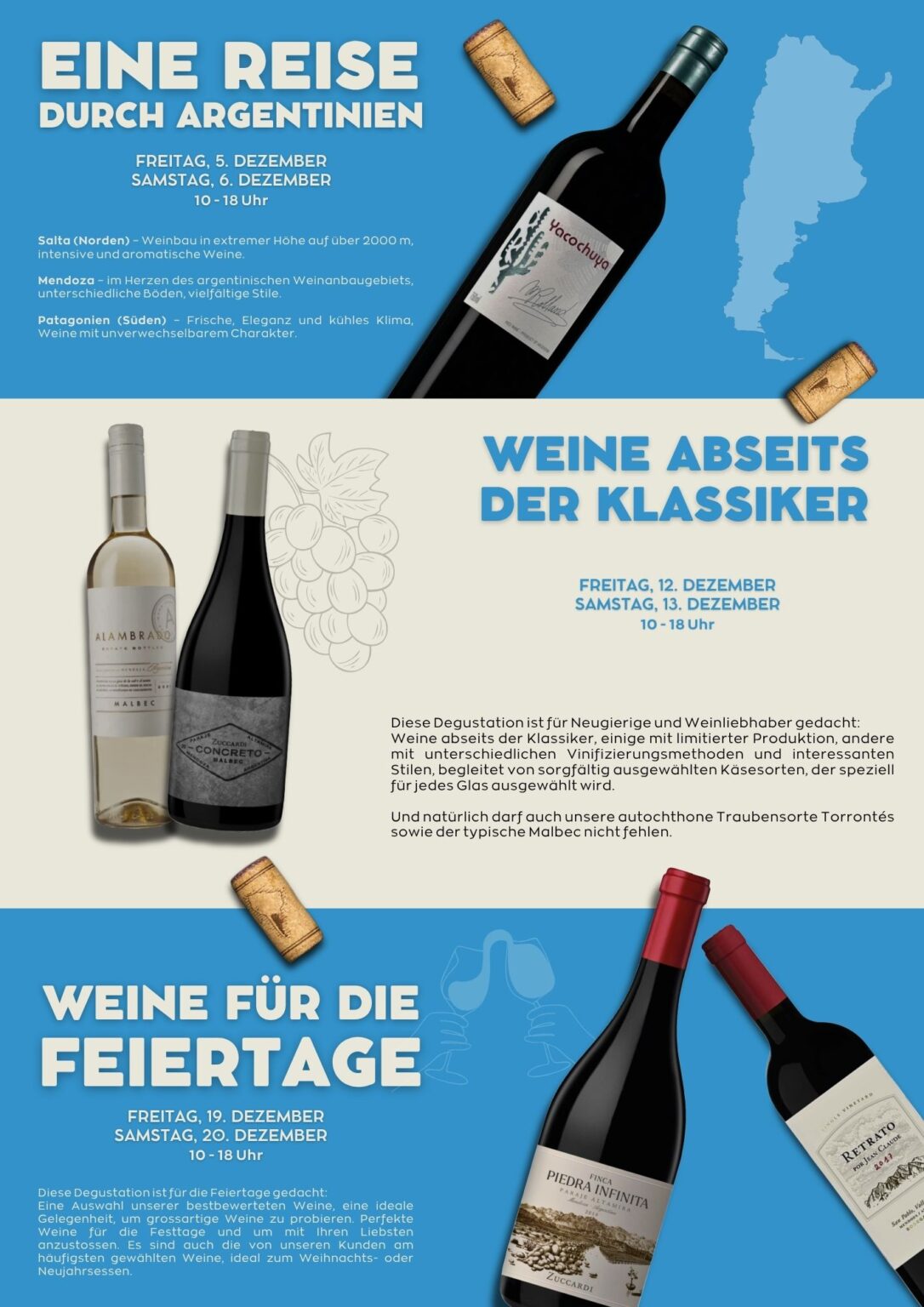 Verpassen Sie nicht unsere Degustationen im Dezember, es wird ein ganz besonderes Event sein, mit Spielen, Musik, Angeboten und vieles mehr.